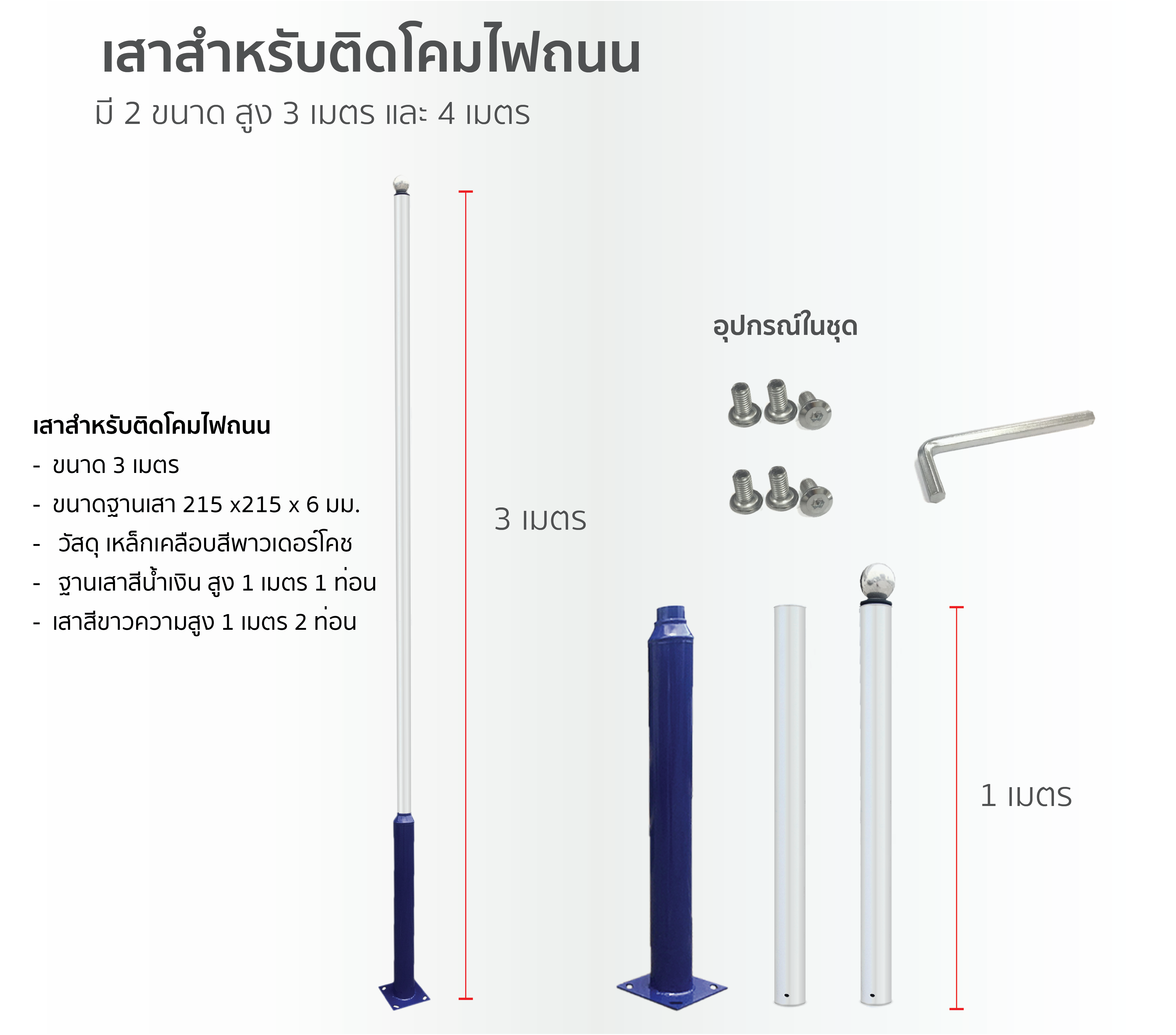 เสาไฟสำหรับติดไฟถนน 3 เมตร เสาไฟแบบ3 ท่อน ท่อนละ 1 เมตร พร้อมอุปกรณ์ประกอบ
