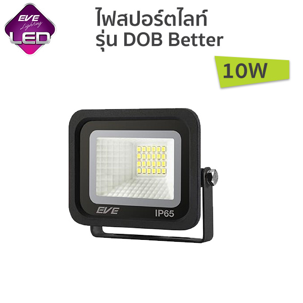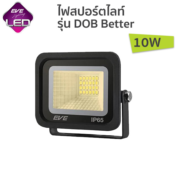 ไฟสปอร์ตไลท์-EVE-LED Floodlight รุ่น DOB Better ตัวโคมสปอร์ตไลท์ผลิตจากอลูมิเนียม หล่อขึ้นรูป มีความแข็งแรง ทนทาน ด้านหลังตัวโคมมีแผงระบายความร้อน สามารถระบายความร้อนได้ดี ช่วยยืดอายุการใช้งานของเม็ดแอลอีดี (LED) ได้นานยิ่งขึ้น มีขนาดกระทัดรัด น้ำหนักเบา ขายึดสปอร์ตไลท์ ผลิตจากเหล็กพ่นกันสนิม ปรับมุมเงยได้ถึง 180° สามารถยึดกับพนังหรือยึดกับพื้นได้ มีแสงให้เลือก 2 แสง ได้แก่ แสงขาว (Daylight) และ แสงส้ม (Warm White) มาตรฐานกันน้ำกันฝุ่น IP65 เหมาะสำหรับติดตั้งภายใน และ ภายนอกอาคาร ในบริเวณที่ต้องการแสงสว่าง เช่น สวนสาธารณะ ป้ายโฆษณา สนามกีฬา หรือ เขตก่องสร้าง เป็นต้น