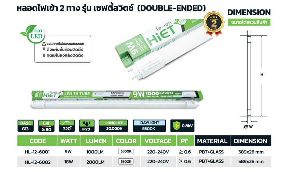 LED T8-HiET รุ่น HL12 เซฟตี้สวิตซ์ ไฟเข้าสองทาง (DOUBLE-ENDED)